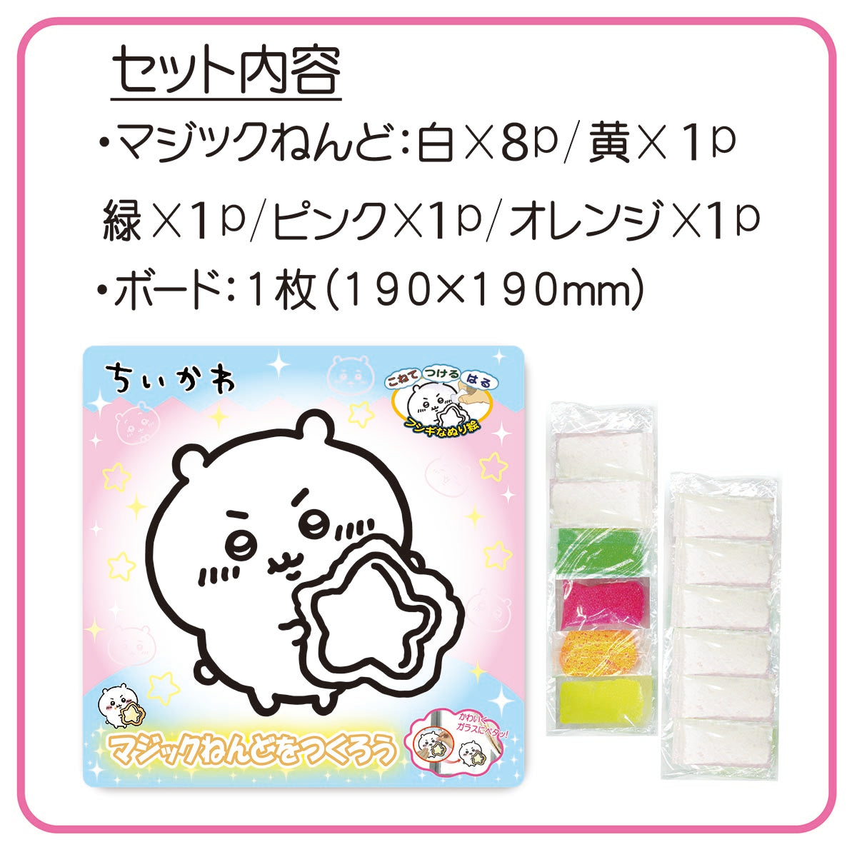 Set contents: Magic Clay??12 pieces (White??8. Yellow??1. Green??1. Pink??1. Orange??1). Board??1 piece