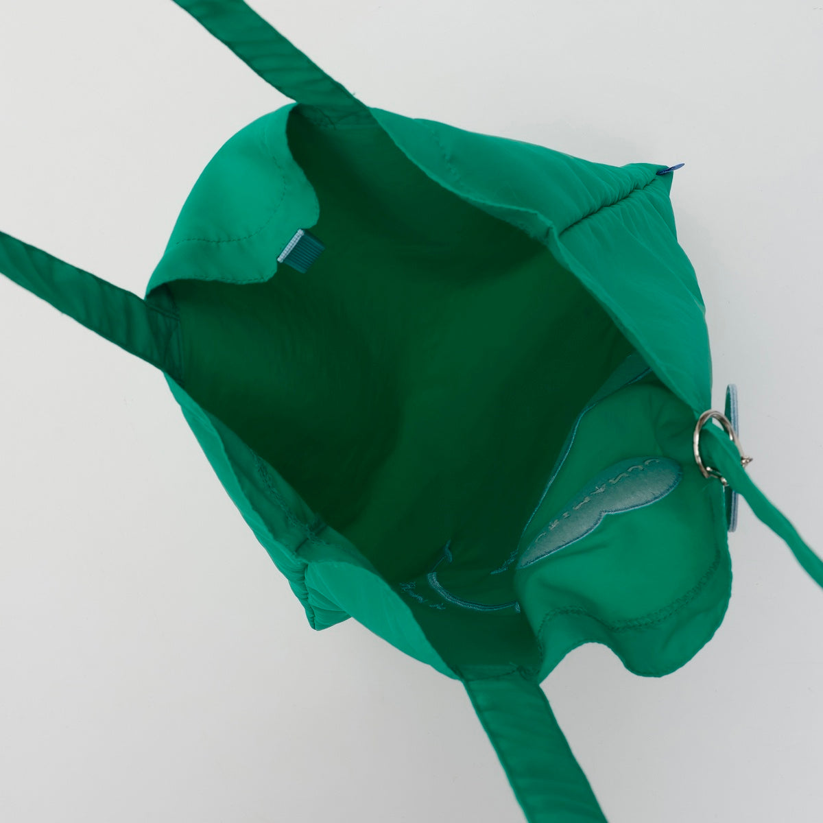 A tote bag with a large embroidery on a vibrant nylon color is here! The handle is a good length for easy shoulder carrying!